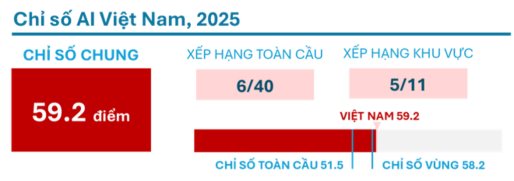 Theo báo cáo, Việt Nam đạt 59,2 điểm trên thang 100, đứng thứ 6 toàn cầu, một vị trí ấn tượng vượt trên nhiều quốc gia phát triển. Chỉ số này là kết quả trung bình của 7 chỉ số thành phần liên quan đến mức độ nhận thức, sử dụng, chấp nhận, tin tưởng và lo ngại về AI.