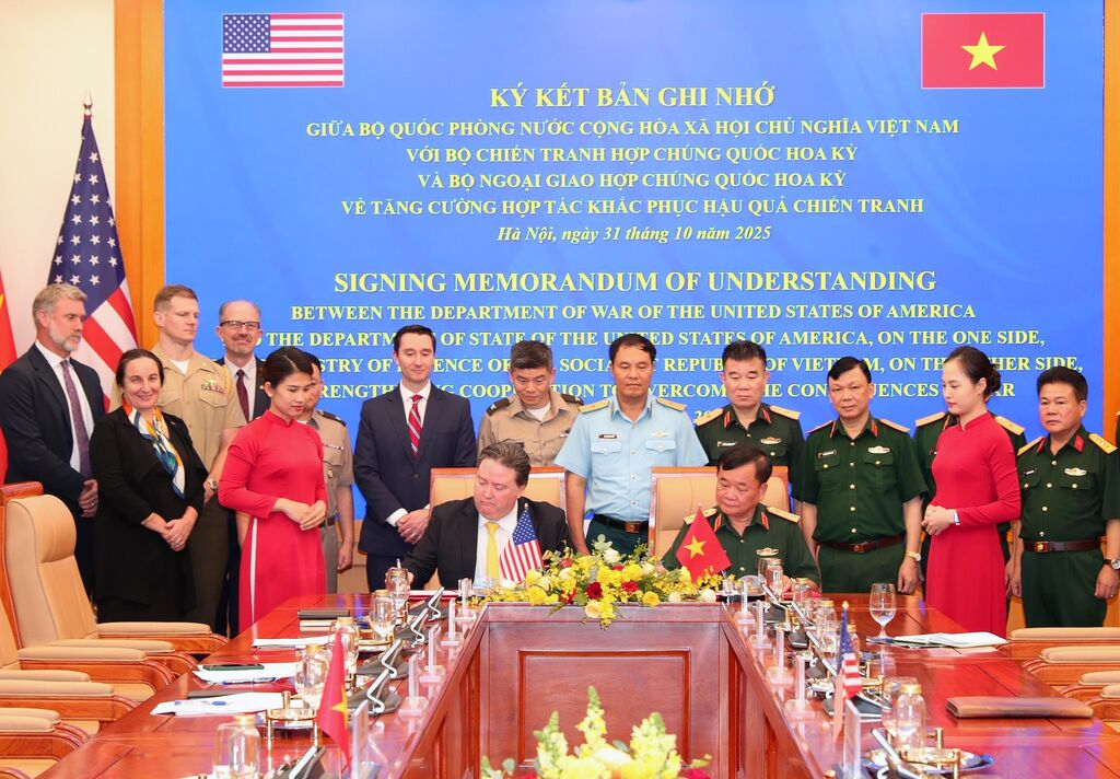 Sáng 31/10, Lễ ký kết Bản ghi nhớ giữa Bộ Quốc phòng nước Cộng hòa xã hội chủ nghĩa Việt Nam với Bộ Chiến tranh và Bộ Ngoại giao Hợp chúng quốc Hoa Kỳ về tăng cường hợp tác khắc phục hậu quả chiến tranh đã diễn ra tại trụ sở Bộ Quốc phòng (Hà Nội).