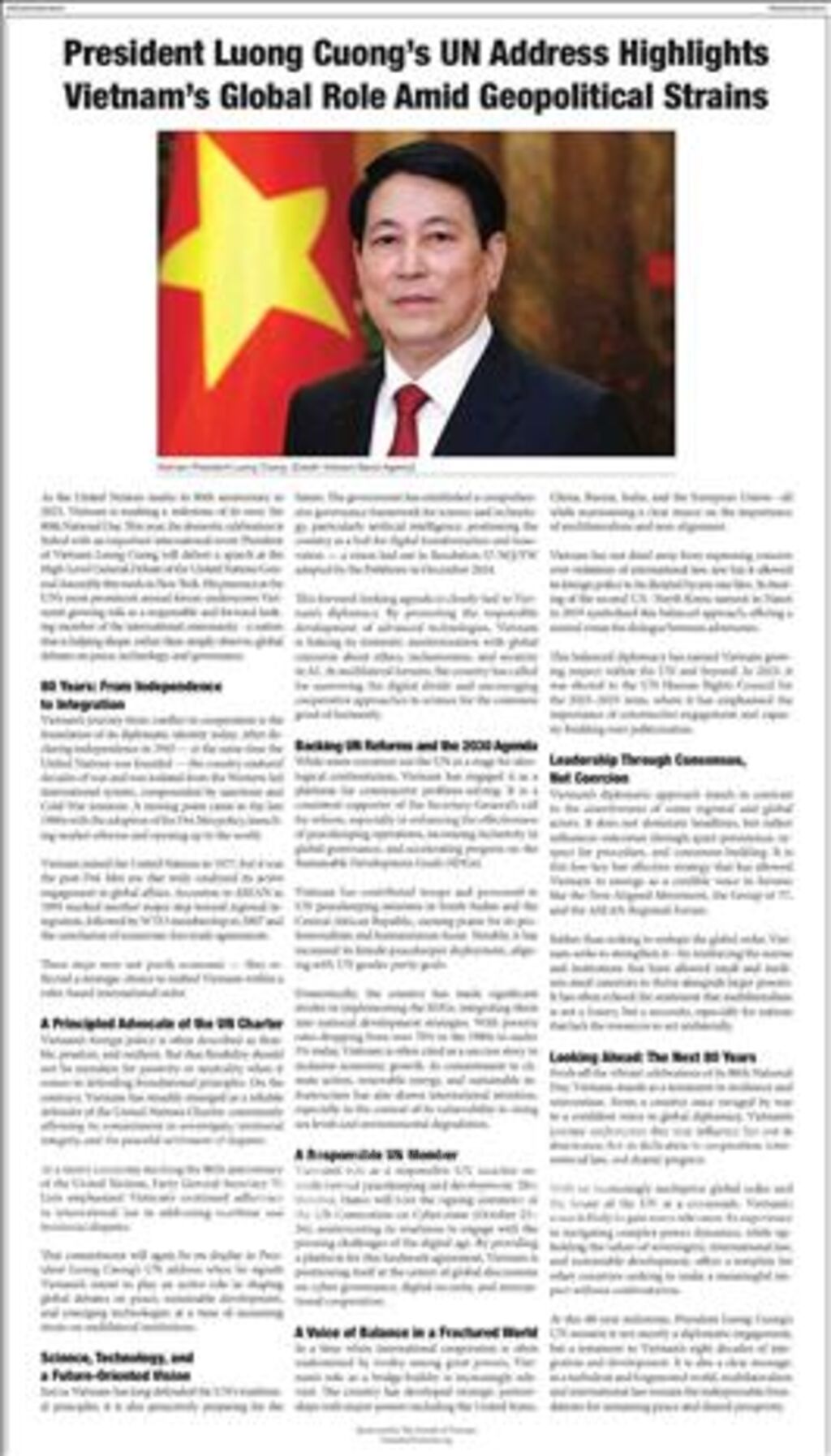Tờ The Washington Times trong một bài phân tích chuyên sâu với tiêu đề "Bài phát biểu của Chủ tịch nước Việt Nam Lương Cường tại LHQ nhấn mạnh vai trò toàn cầu của Việt Nam trong bối cảnh căng thẳng địa chính trị", đã nhấn mạnh vai trò ngày càng lớn của Việt Nam với tư cách một quốc gia "có trách nhiệm và hướng tới tương lai". Bài viết đặc biệt ghi nhận hành trình chuyển mình ấn tượng của Việt Nam - từ một đất nước bị tàn phá bởi chiến tranh, từng bị cô lập trong thời kỳ Chiến tranh Lạnh, nay đã vươn lên trở thành một quốc gia hội nhập sâu rộng với cộng đồng quốc tế.
