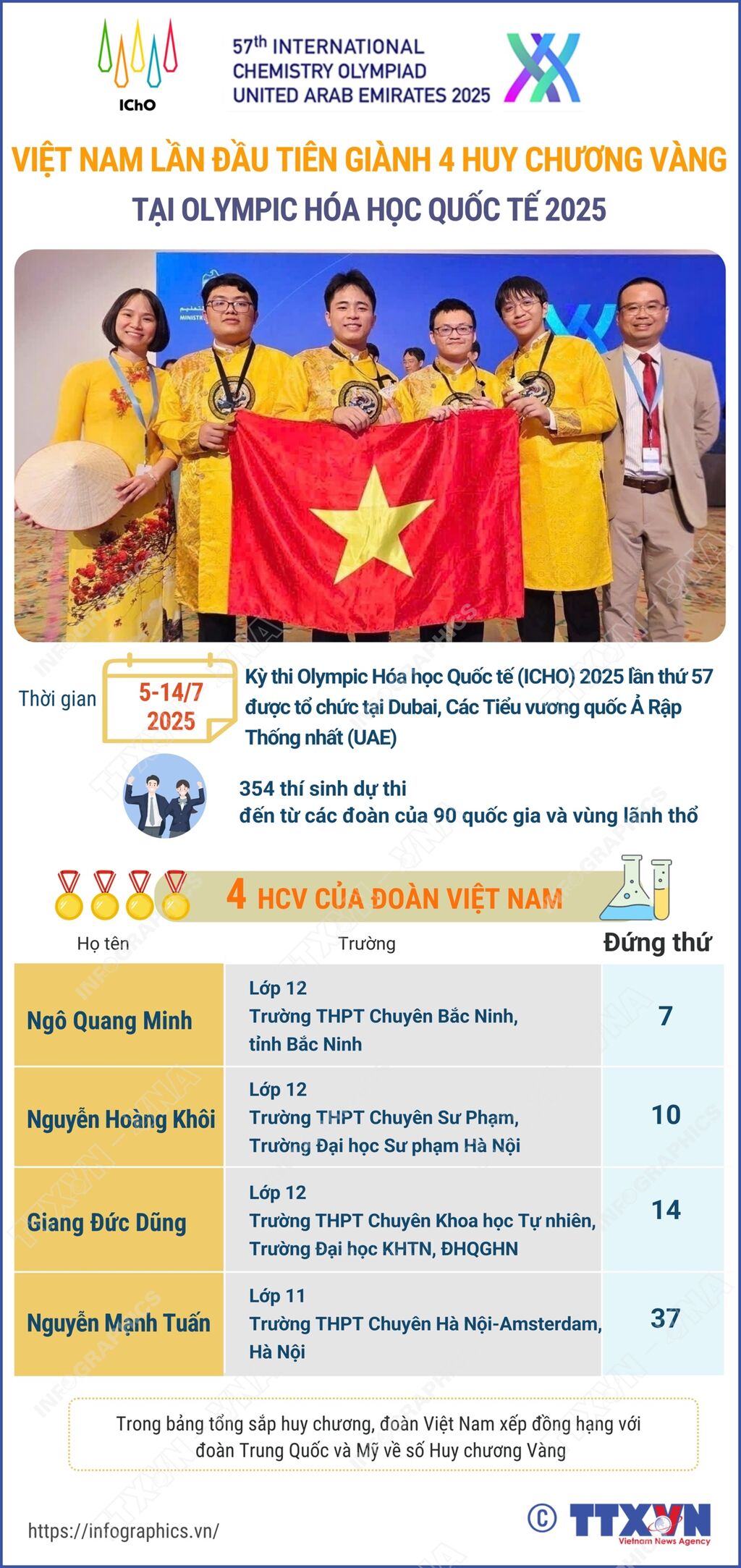 Đội tuyển Việt Nam đã xuất sắc giành 4 Huy chương Vàng, trong đó có 2 Huy chương Vàng nằm trong top 10 tại Kỳ thi Olympic Hóa học Quốc tế (ICHO) 2025. Đây cũng là lần đầu tiên trong lịch sử, Việt Nam giành 4 Huy chương Vàng trong một Kỳ thi ICHO được tổ chức trực tiếp.