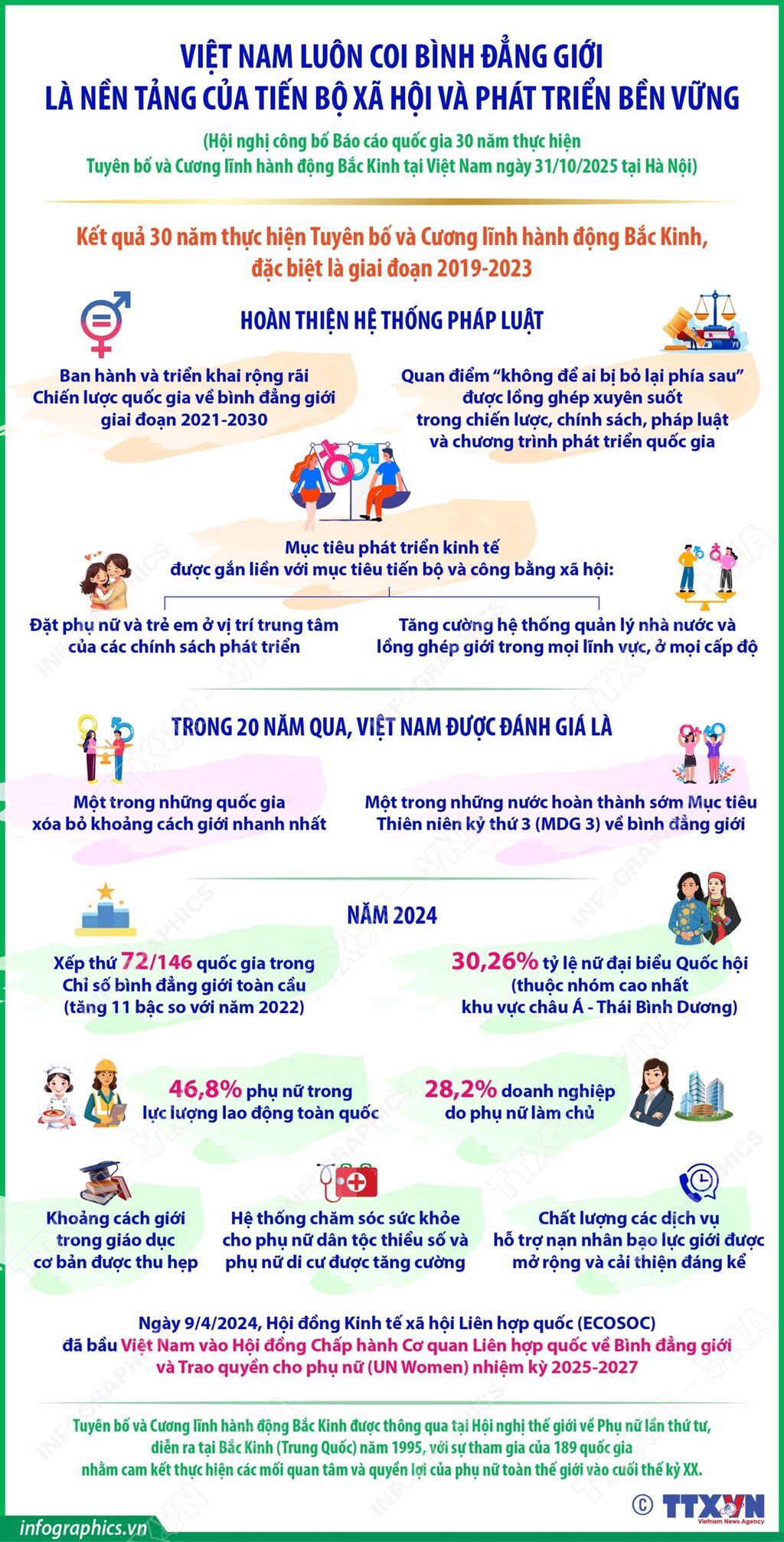 Ngày 31/10/2025, Bộ Nội vụ chủ trì, phối hợp với Cơ quan Liên Hợp quốc về Bình đẳng giới và Trao quyền cho phụ nữ (UN Women) tại Việt Nam tổ chức Hội nghị công bố Báo cáo quốc gia về 30 năm thực hiện Tuyên bố và Cương lĩnh Hành động Bắc Kinh tại Việt Nam. Sự kiện này đánh dấu một cột mốc quan trọng trong hành trình ba thập kỷ nỗ lực vì bình đẳng giới và trao quyền cho phụ nữ, thể hiện rõ cam kết chính trị nhất quán của Việt Nam đối với các mục tiêu phát triển bền vững của Liên Hợp Quốc.