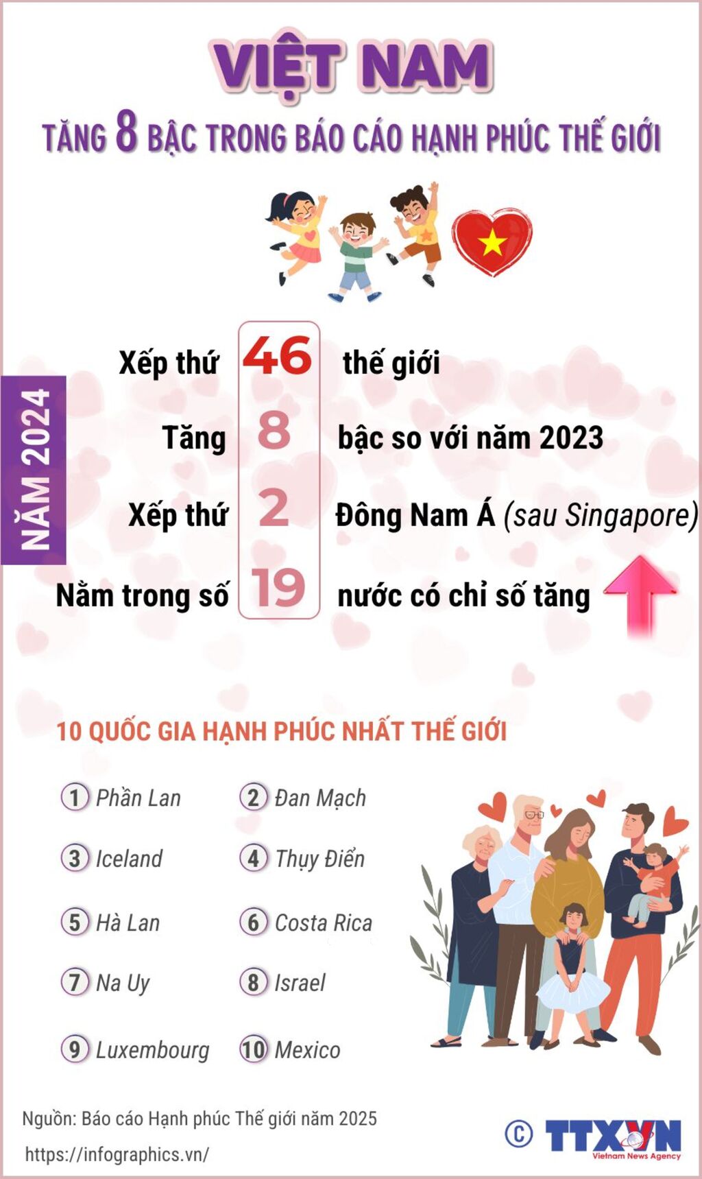 | Việt Nam tăng 8 bậc trong Báo cáo Hạnh phúc Thế giới |