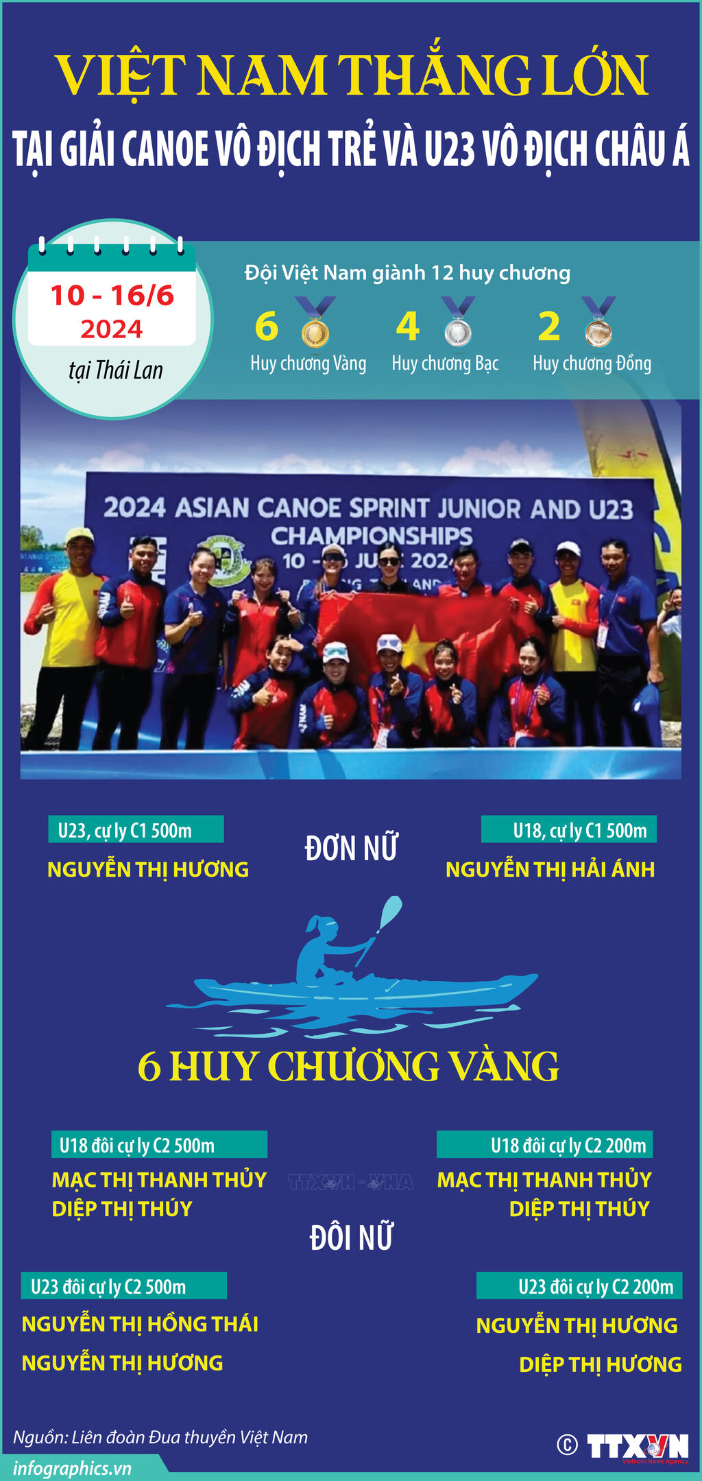 Hà Nội (TTXVN 17/6) Đội tuyển Canoe Việt Nam giành được tổng cộng 12 huy chương các loại (6 Huy chương Vàng, 4 Huy chương Bạc và 2 Huy chương Đồng) tại Giải Canoe vô địch trẻ và U23 vô địch châu Á diễn ra từ ngày 10 - 16/6/2024 tại Thái Lan.