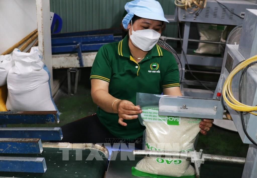 | Đóng gói túi gạo tại Công ty TNHH Vinh Hiển ở huyện Gò Công Tây (Tiền Giang). Ảnh: Hữu Chí – TTXVN |