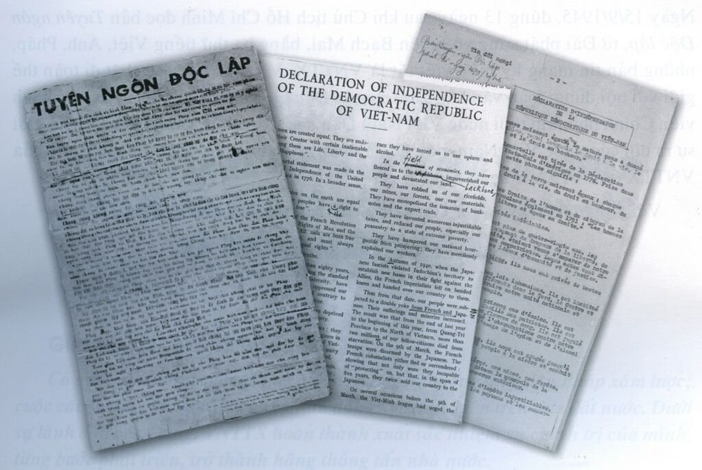 | Bản Tuyên ngôn Độc lập, do Chủ tịch Hồ Chí Minh đọc tại Quảng trường Ba Đình lịch sử ngày 2/9/1945, được Việt Nam Thông tấn xã phát đi toàn thế giới bằng ba thứ tiếng Việt, Anh, Pháp vào ngày 15/9/1945 |