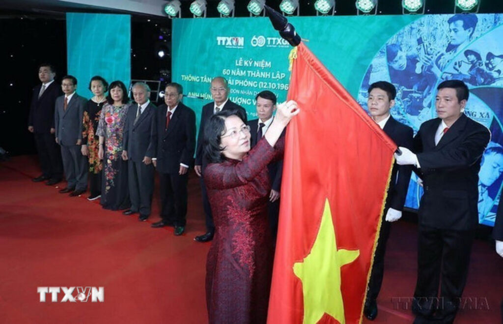 | Thừa ủy quyền của Chủ tịch nước, Phó Chủ tịch nước Đặng Thị Ngọc Thịnh gắn danh hiệu Anh hùng Lực lượng vũ trang nhân dân tặng Thông tấn xã Giải phóng lên lá cờ truyền thống của TTXVN tại Lễ kỷ niệm 60 năm Ngày thành lập TTXGP (12/10/1960-12/10/2020). |