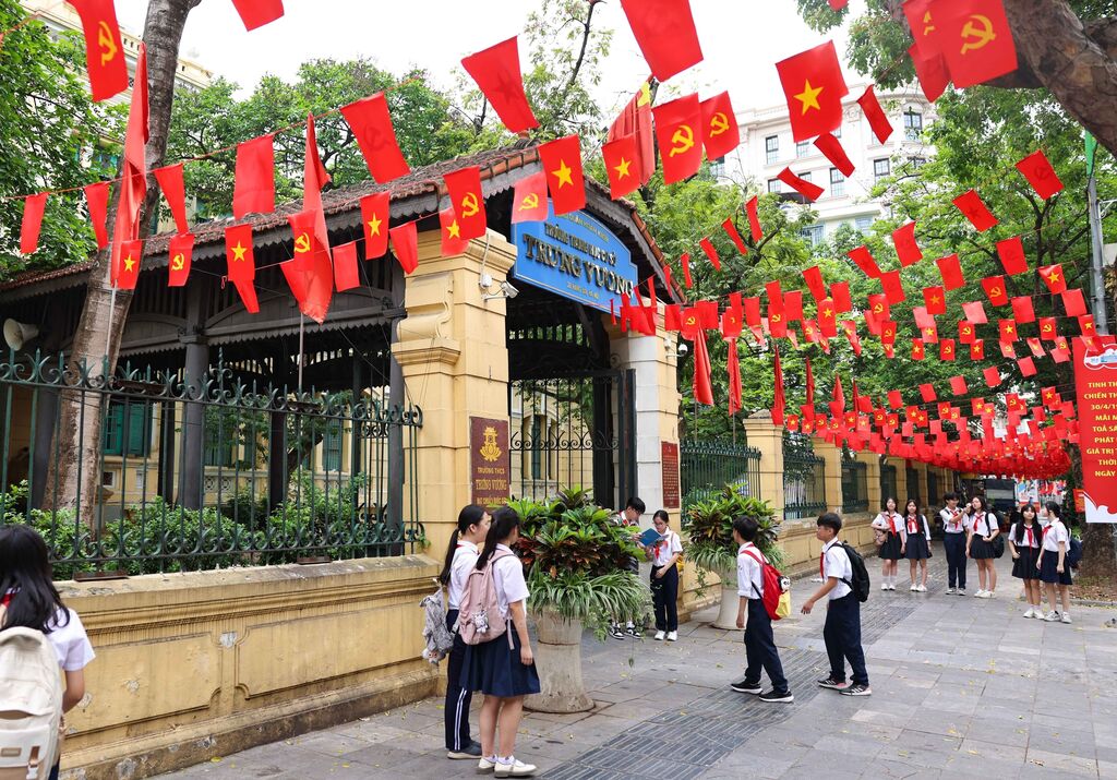 Nằm ở góc ngã tư phố Hàng Bài và phố Lý Thường Kiệt (Hoàn Kiếm, Hà Nội), trường THCS Trưng Vương không chỉ là chiếc nôi đào tạo nhiều thế hệ học sinh tài năng mà còn mang trong mình niềm tự hào đặc biệt - vinh dự 5 lần được đón Bác Hồ kính yêu đến thăm. Những ngày tháng 5 lịch sử, hướng về kỷ niệm 135 Ngày sinh của Bác (19/5/1890 - 19/5/2025), cờ đỏ sao vàng được trang hoàng rực rỡ khắp ngôi trường, thầy và trò nhà trường đang tích cực thi đua lập thành tích mừng sinh nhật Người với tất cả lòng biết ơn, kính yêu vô hạn. Ảnh: Thanh Tùng - TTXVN