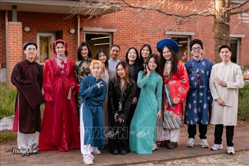 | Các bạn sinh viên Việt Nam tự ào được khoác lên mình những chiếc áo mang đậm bản sắc văn hóa của Việt Nam. Ảnh: TTXVN phát |