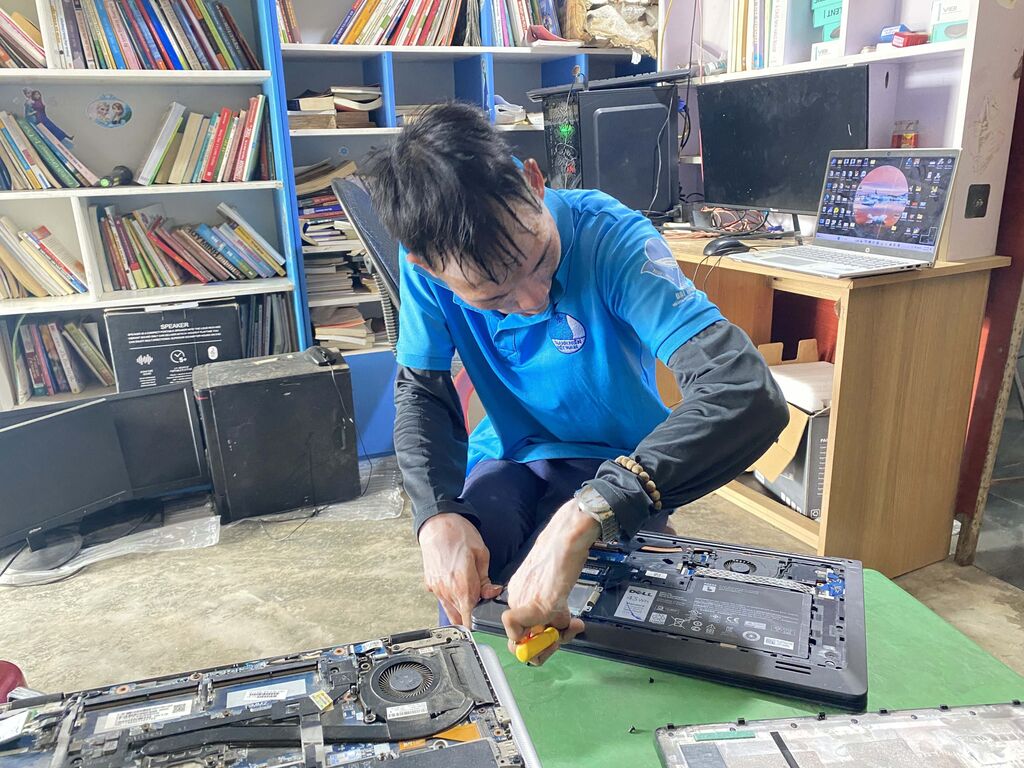 | Là người đam mê công nghệ, anh Lê Thái Bình đã học hỏi và có khả năng sửa máy tính để kiếm thêm thu nhập. |