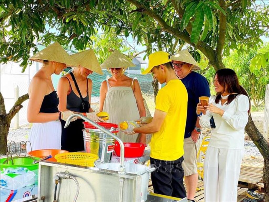 | Du khách nước ngoài thích thú với trải nghiệm làm các sản phẩm từ quả xoài dưới tán cây xoài Cam Lâm, tỉnh Khánh Hòa. |
