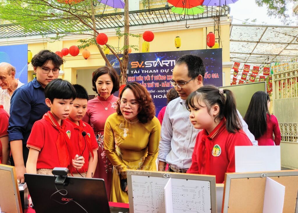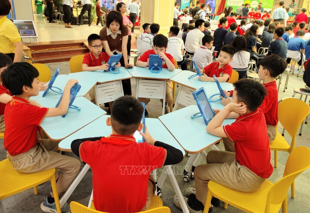 | Học sinh Trường Tiểu học Tràng An (quận Hoàn Kiếm, Hà Nội) trải nghiệm các sản phẩm chuyển đổi số. |