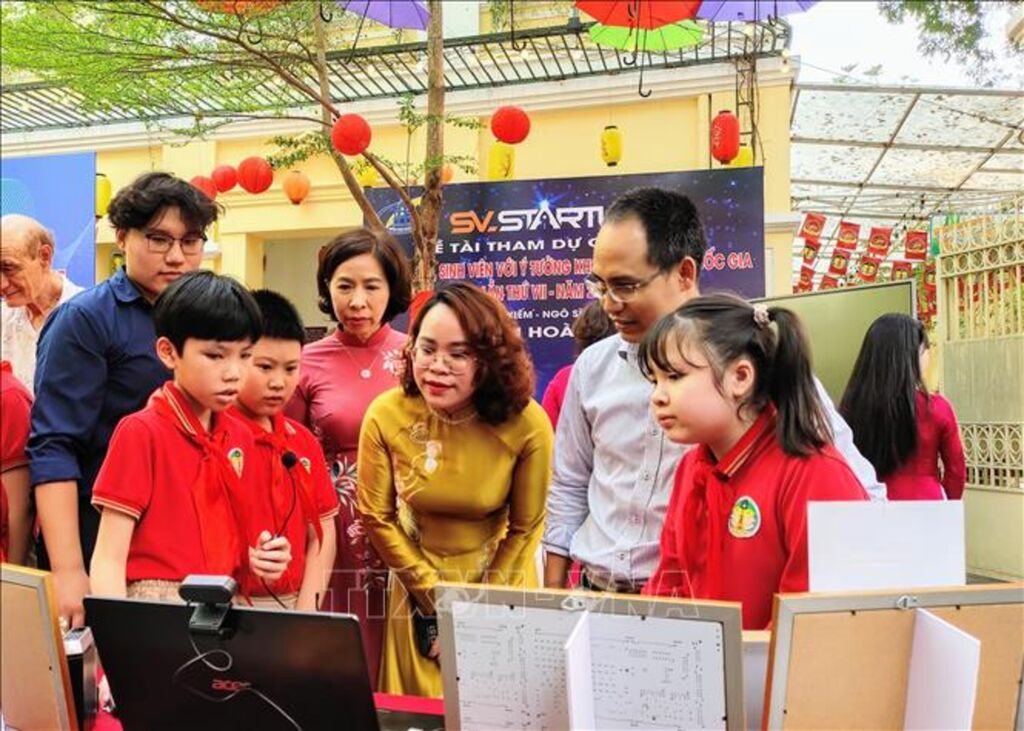 | Học sinh Trường Tiểu học Tràng An (quận Hoàn Kiếm, Hà Nội) trải nghiệm các sản phẩm chuyển đổi số. |
