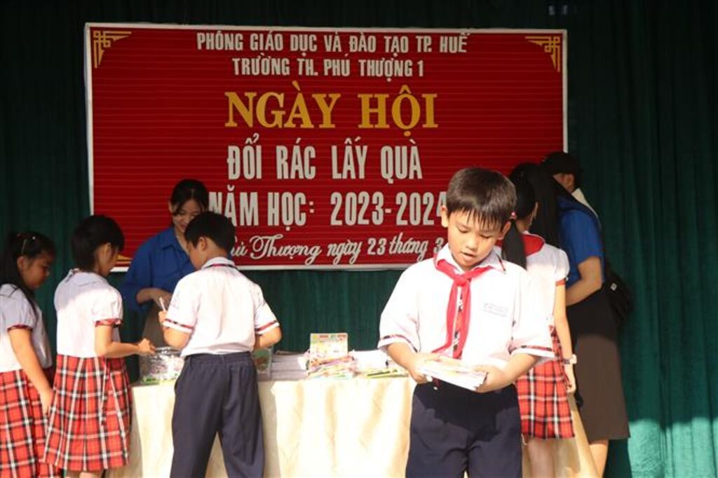 | Các học sinh thích thú tham gia Ngày hội Đổi rác lấy quà. |