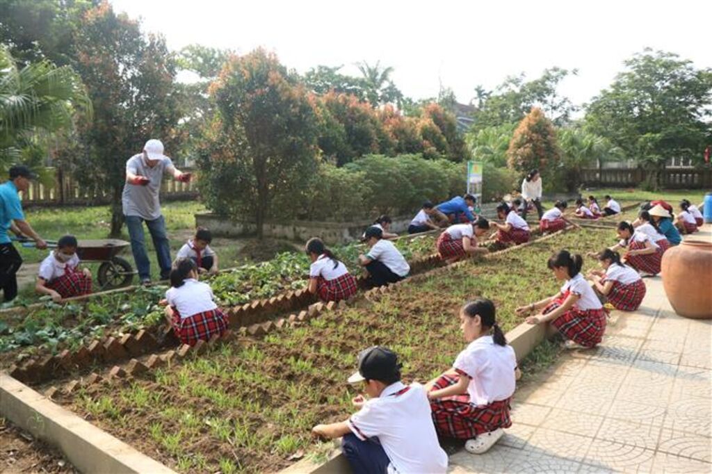 | Thầy và trò trường Tiểu học Phú Thượng (thành phố Huế) chăm sóc, bón phân hữu cơ cho vườn rau bán trú. |