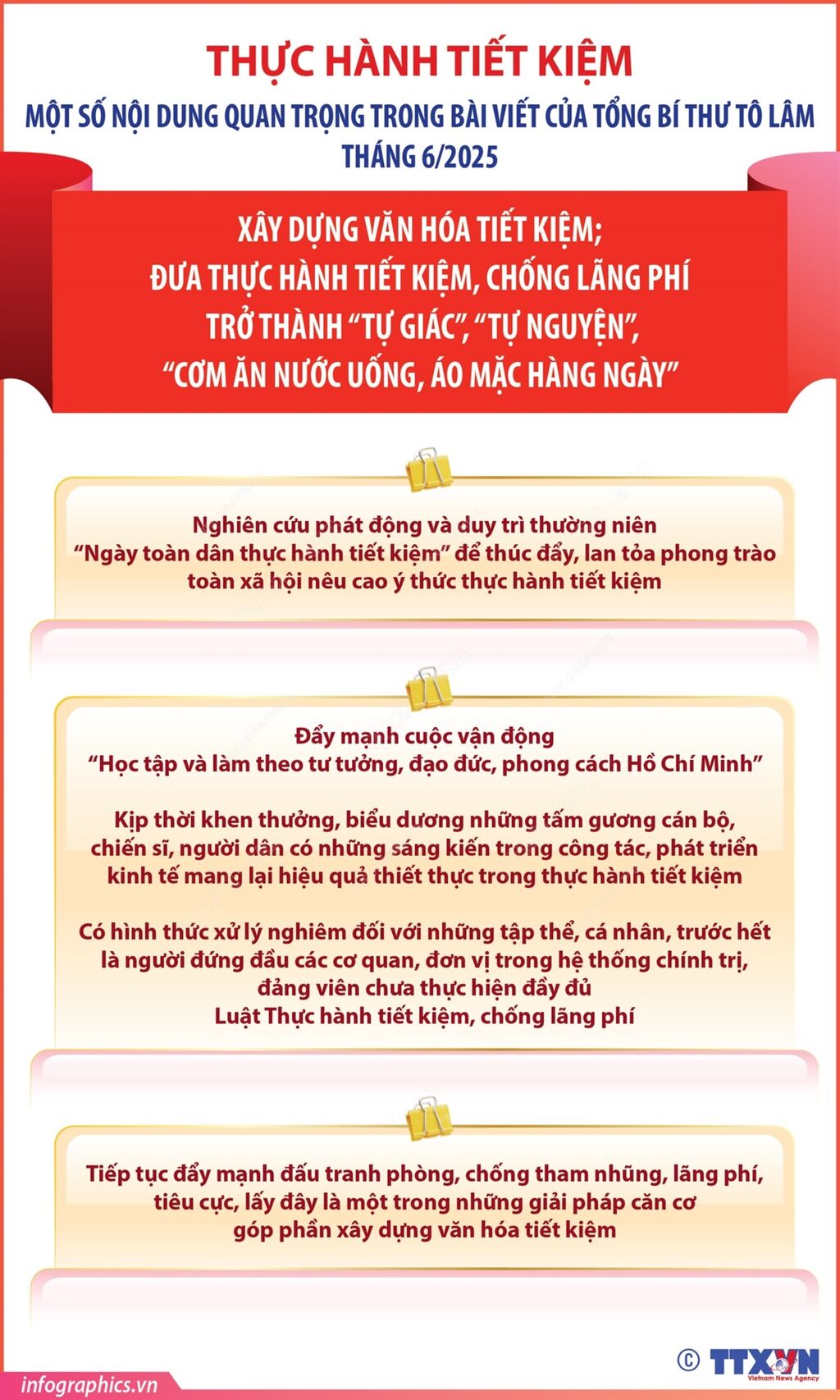 Trong bài viết “Thực hành tiết kiệm” viết ngày 1/6/2025, Tổng Bí thư Tô Lâm nhấn mạnh cần tập trung thực hiện tốt vấn đề: Thống nhất nhận thức, thực hành tiết kiệm, chống lãng phí là một trong những giải pháp căn cơ nhất để đất nước vượt qua mọi bão giông trong bối cảnh tình hình quốc tế có nhiều biến động, tác động trực tiếp, nhiều mặt đến phát triển kinh tế- xã hội và bảo đảm an sinh. Mọi công dân và các cơ quan, đơn vị, tổ chức, doanh nghiệp cần có kế hoạch cụ thể, thực hiện thu-chi hợp lý; cán bộ, đảng viên, nhất là cán bộ lãnh đạo, quản lý phải gương mẫu, vận động gia đình, nhân dân tích cực tham gia; mọi ngành, mọi nghề, mọi nhà, mọi người đẩy mạnh sản xuất, kinh doanh, nâng cao năng suất, chất lượng và hiệu quả lao động sản xuất, triệt để thực hành tiết kiệm, hạn chế tới mức thấp nhất sự lãng phí cả về thời gian, tiền bạc, của cải, sức lực.