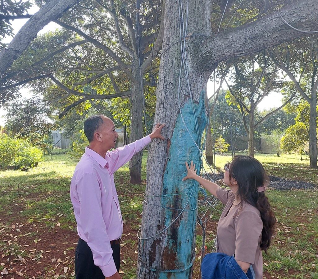 | Cán bộ kỹ thuật Công ty cổ phần Phát triển Công nghệ Sinh học Dona chia sẻ về vườn cây sầu riêng đầu ròng. Ảnh: Bích Hồng/Bnews/vnanet.vn |