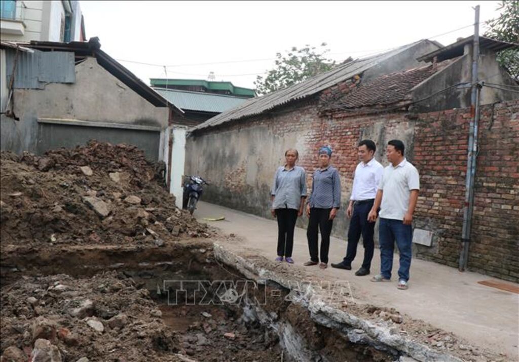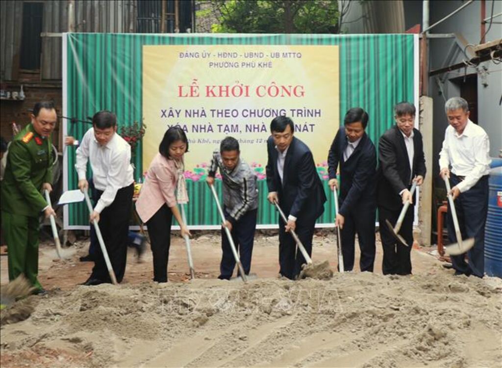 | Các đại biểu thực hiện nghi lễ khởi công nhà tại phường Phù Khê, thành phố Từ Sơn, tỉnh Bắc Ninh. |