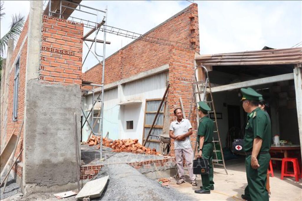 | Chiến sỹ Đồn Biên phòng Ia Rvê (Đắk Lắk) động viên một gia đình chính sách đang xây dựng nhà mới theo Chương trình xóa nhà tạm. |