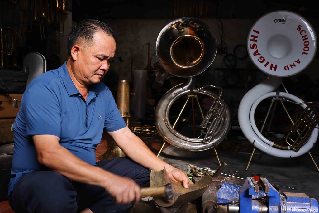Ông Nguyễn Văn Hưởng, hội kèn Trại Đáy, xã Hải Minh (Hải Hậu) cùng con trai kiểm tra và sửa chữa kèn. Ảnh: Minh Đức - TTXVNNgười dân nơi đây tự mày mò học sửa kèn, truyền nhau kinh nghiệm rồi làm kèn đồng, dần dần hình thành nghề làm kèn đồng ở làng Phạm Pháo. Ảnh: Minh Đức – TTXVNVợ và con gái ông Nguyễn Văn Hưởng với công đoạn hàn pháo của kèn. Ảnh: Minh Đức - TTXVNGiáo dân Nguyễn Văn Hưởng kiểm tra kèn thành phẩm. Ảnh: Minh Đức - TTXVNÔng Nguyễn Văn Hưởng, hội kèn Trại Đáy, xã Hải Minh (Hải Hậu) cùng con trai kiểm tra kèn thành phẩm. Ảnh: Minh Đức - TTXVNGiáo dân Nguyễn Văn Cường, làng Phạm Pháo, Hải Minh, huyện Hải Hậu, tỉnh Nam Định) là thế hệ thứ 2 trong gia đình làm nghề kèn đồng giới thiệu với khách về các loại kèn tại cơ sở sản xuất. Ảnh: Minh Đức - TTXVNGiáo dân Nguyễn Văn Hưởng, hội kèn Trại Đáy, xã Hải Minh (Hải Hậu) với hơn 30 năm làm nghề. Ảnh: Minh Đức - TTXVN"Điểm riêng của nghề làm kèn đồng Phạm Pháo là hầu hết công đoạn đều được thực hiện thủ công. Những ống đồng được cán phẳng, gò tay thành một chiếc kèn và chỉ sử dụng máy uốn tự chế, máy tiện cho các chi tiết và công đoạn khó. Ảnh: Minh Đức – TTXVNGia đình ông Nguyễn Văn Cường có truyền thống sửa kèn đồng khi ông Nguyễn Văn Biên (bố ông Cường) là một trong những người đầu tiên làm nghề này từ những năm 1950. Ảnh: Minh Đức - TTXVN