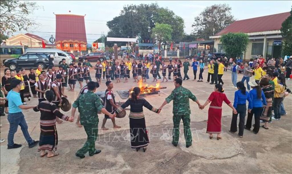 | Cán bộ, chiến sĩ Đồn Biên phòng Ia Pnôn đón Tết cùng đồng bào dân tộc thiểu số nơi vùng biên giới Đức Cơ. |