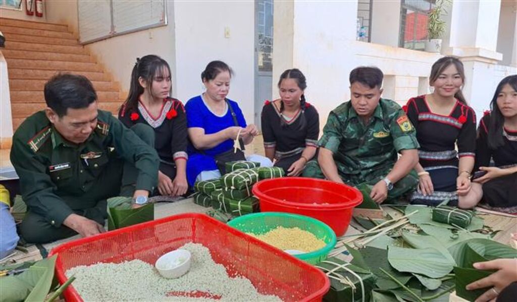 | Cán bộ, chiến sĩ Đồn Biên phòng Ia Pnôn gói bánh chưng cùng đồng bào dân tộc thiểu số nơi vùng biên giới Đức Cơ. |
