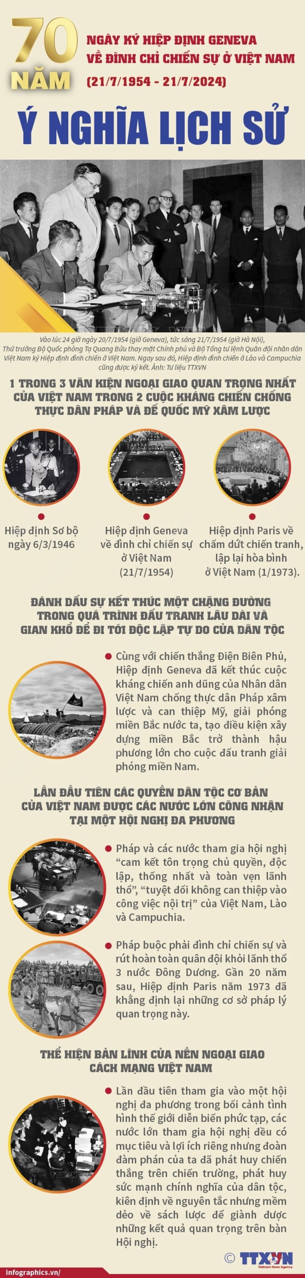 Tròn 70 năm trước, ngày 21/7/1954, Hiệp định Geneve về đình chỉ chiến sự ở Việt Nam đã được ký kết. Trải qua 75 ngày đêm đàm phán với 31 phiên họp, trong đó có các phiên họp toàn thể, phiên họp cấp trưởng đoàn cùng nhiều cuộc tiếp xúc song phương và đa phương, Hiệp định Geneva về đình chỉ chiến sự ở Việt Nam đã được ký vào ngày 21/7/1954. Hiệp định Geneva về đình chỉ chiến sự ở Việt Nam cùng với Hiệp định Sơ bộ ngày 6/3/1946 và Hiệp định Paris năm 1973 đã trở thành 3 văn kiện ngoại giao quan trọng nhất trong hai cuộc kháng chiến chống thực dân Pháp và đế quốc Mỹ xâm lược của dân tộc ta.